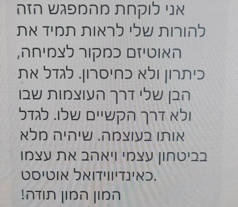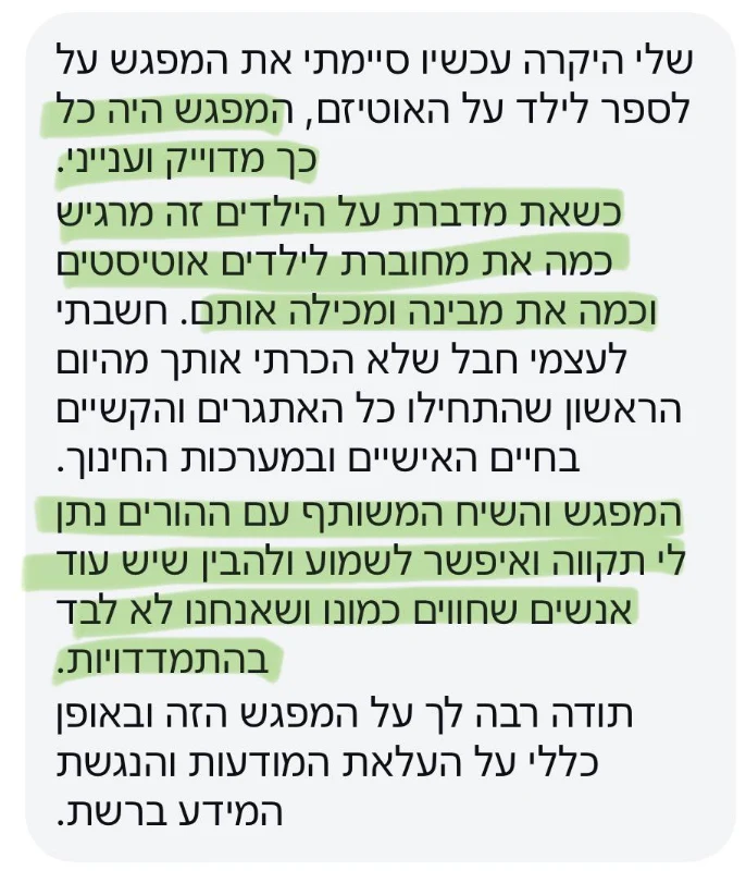 היום אני מלווה הורים לילדים אוטיסטים להבין את העולם הפנימי של הילד שלהם, ליצור איתו קשר עמוק ומיטיב, ולתת לו כלים להיות עצמאי – תוך שהם גם חוזרים ליהנות מההורות.