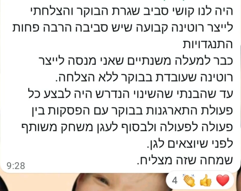 צריך לצאת לסבתא? הילד מתכונן, אתם מזכירים לו כמה דקות לפני, והמעבר קורה בלי התפרצות. ההתארגנויות, המעברים, היציאות – הכל נעשה קל יותר.